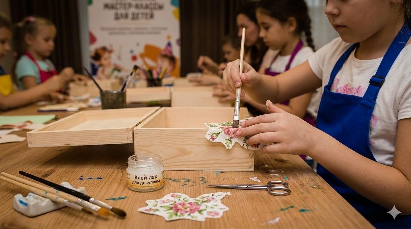 У нас проходят творческие мастер-классы: изготовление поделок, создание картин и искусство декупажа. Это отличный формат, чтобы детям было интересно и весело провести время.